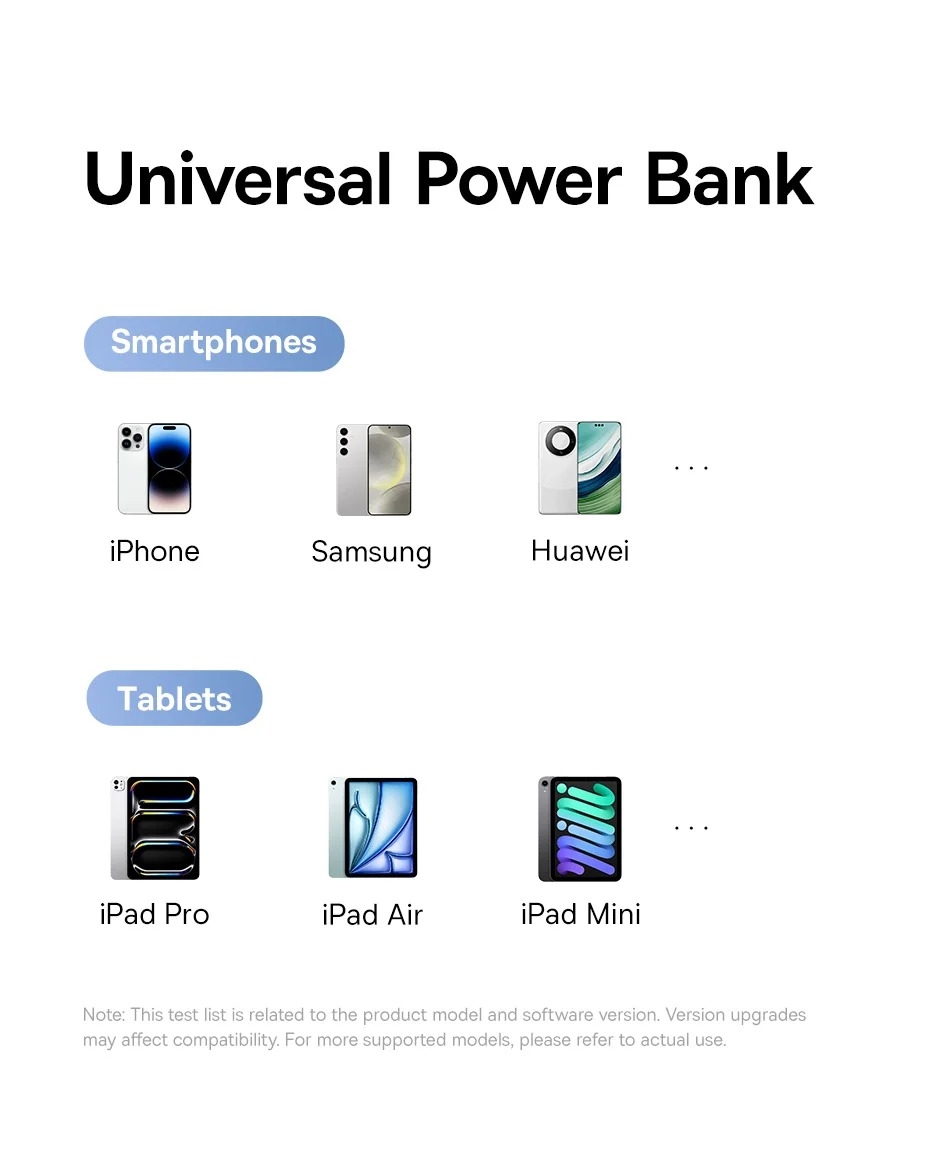 مجهز به یک عدد پورت خروجی Type-C، یک عدد پورت خروجی Micro USB، یک عدد کابل متصل Type-C، یک عدد کابل متصل Lightning، با حداکثر توان خروجی 22.5 وات