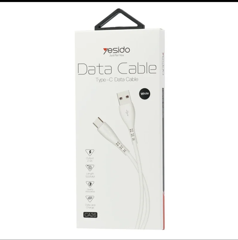 کابل تایپ سی Yesido CA26 2.4A ساخته شده از پلاستیک باکیفیت TPE به طول 100 سانتیمتر، مقاوم در برابرکشش و گره خوردگی، شدت جریان عبوری 2.4 آمپر با مقاومت بالا در برابر نوسانات برق، پشتیبانی از فناوری شارژ سریع